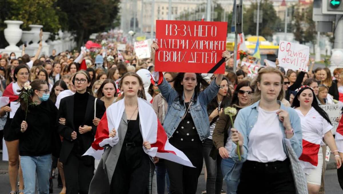 Thousands of women marched in Minsk today, demanding the resignation of Belarusian President Alexander Lukashenko, and students gathered to protest the arrest of colleagues.