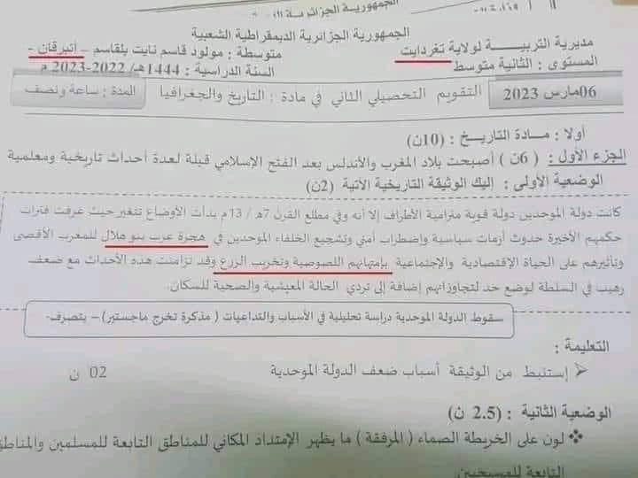 The Directorate explained that this decision came as a result of what was issued by the Ministry of Interior "An individual act of a professor of history and geography"Where he included in the exam an exam text on history and geography, he says: "The migration of the Banu Hilal Arabs to Al-Aqsa Morocco and their impact on economic and social life, through their degradation of thieves and crops".