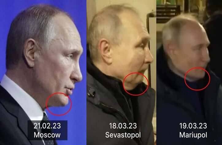 The pictures, which are published as being taken during late February and March, show changes in the shape of President Putin, especially in the chin area, as the publications were accompanied by a question. “Which one do you think is real?”.