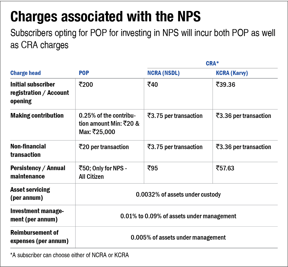 On registering for the first time, you will have to pay a charge of Rs 200 to Rs 400. 0.50% of the contribution for initial contribution and final contribution, subject to a minimum of Rs. 30 and max. Rs. 25,000 with 0.20% contribution for e-NPS continuous contribution, minimum Rs.15 and maximum Rs.10000 is applicable for all NPS accounts. Persistence fee of Rs 30 is charged for all non-financial transactions