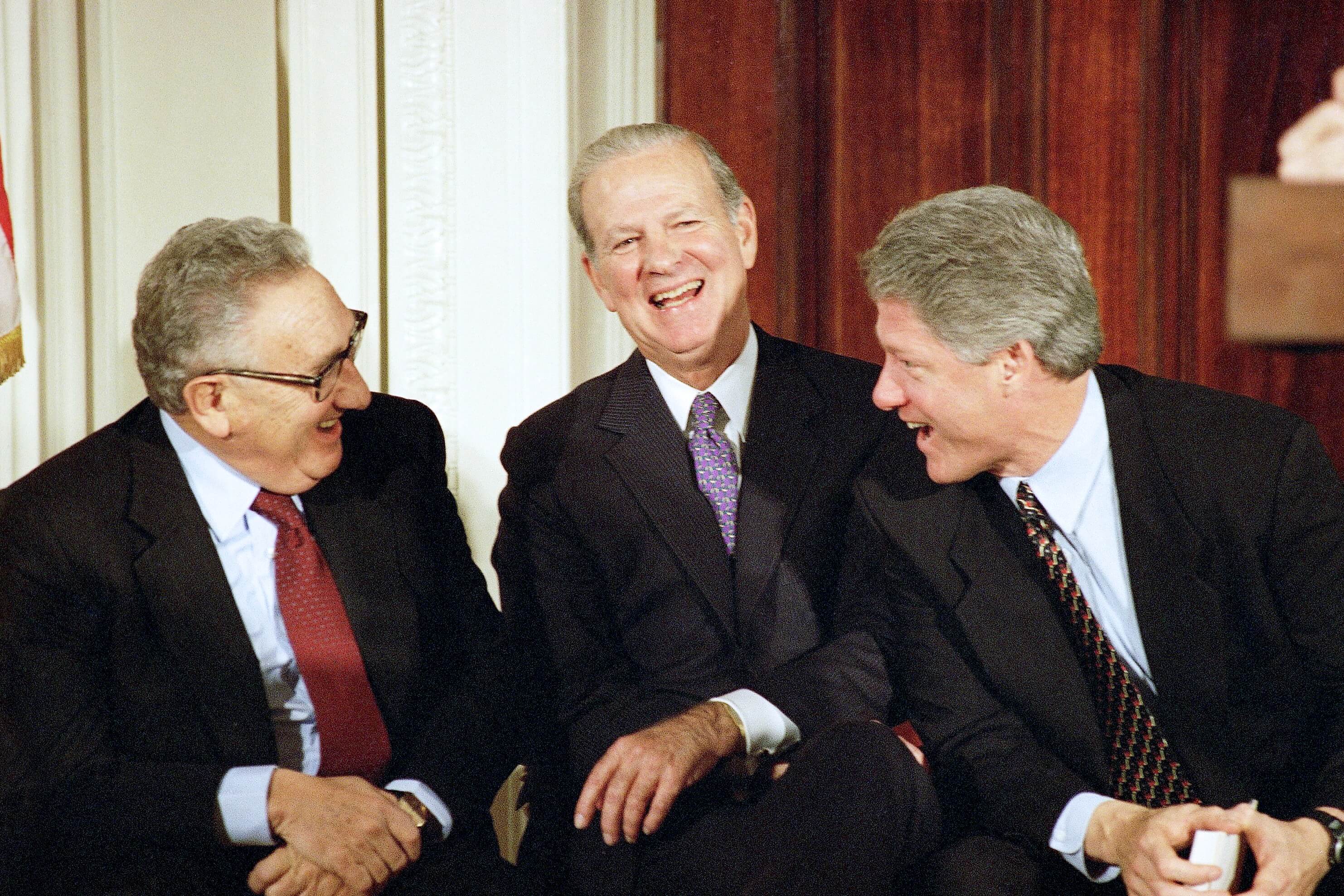 President Bill Clinton speaks with former Secretaries of State Henry Kissinger and James A. Baker III. Photo: AP Photo/Dennis Cook